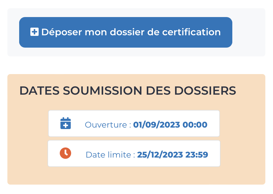 A droite, l’interface personnelle qui permet d’accéder facilement au dépôt de votre dossier grâce au bouton Déposer mon dossier de certification. Également, les dates de soumission vous y sont rappelées.