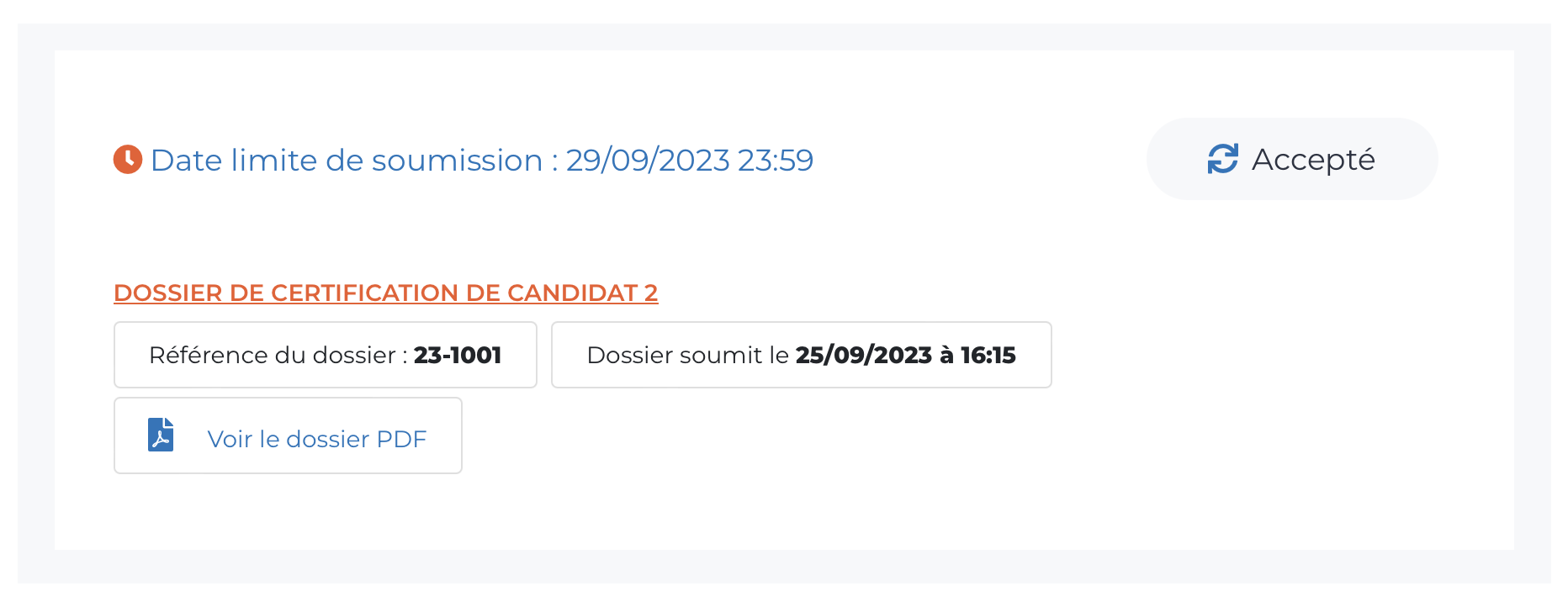 Lorsque vous aurez soumis votre dossier de certification, un bloc MON DOSSIER apparaitra pour que vous puissiez consulter l’historique et les informations de votre dépôt de dossier.